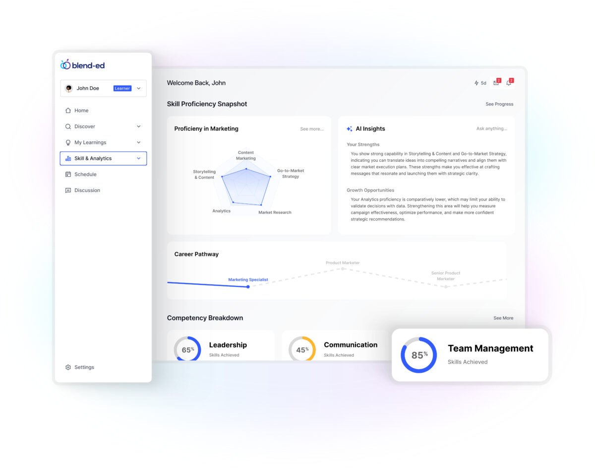 Blend-ed combines an LMS, Authoring Studio, and Learning Experience Platform (LXP), powered by AI. Teams can create structured courses using the AI Course Creator, support learners with an AI Tutor, and manage training workflows through built-in automation and reporting.