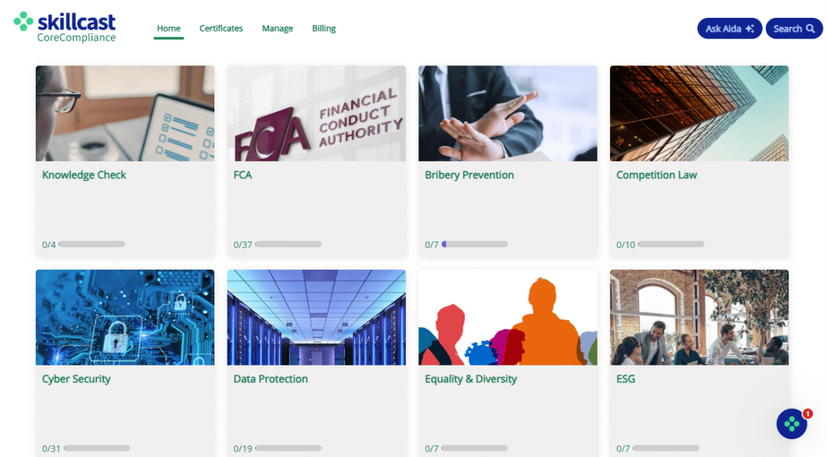- Relevant curated content: Courses mapped to GDPR, AML, Bribery, FCA topics, Cybersecurity and Health & Safety.