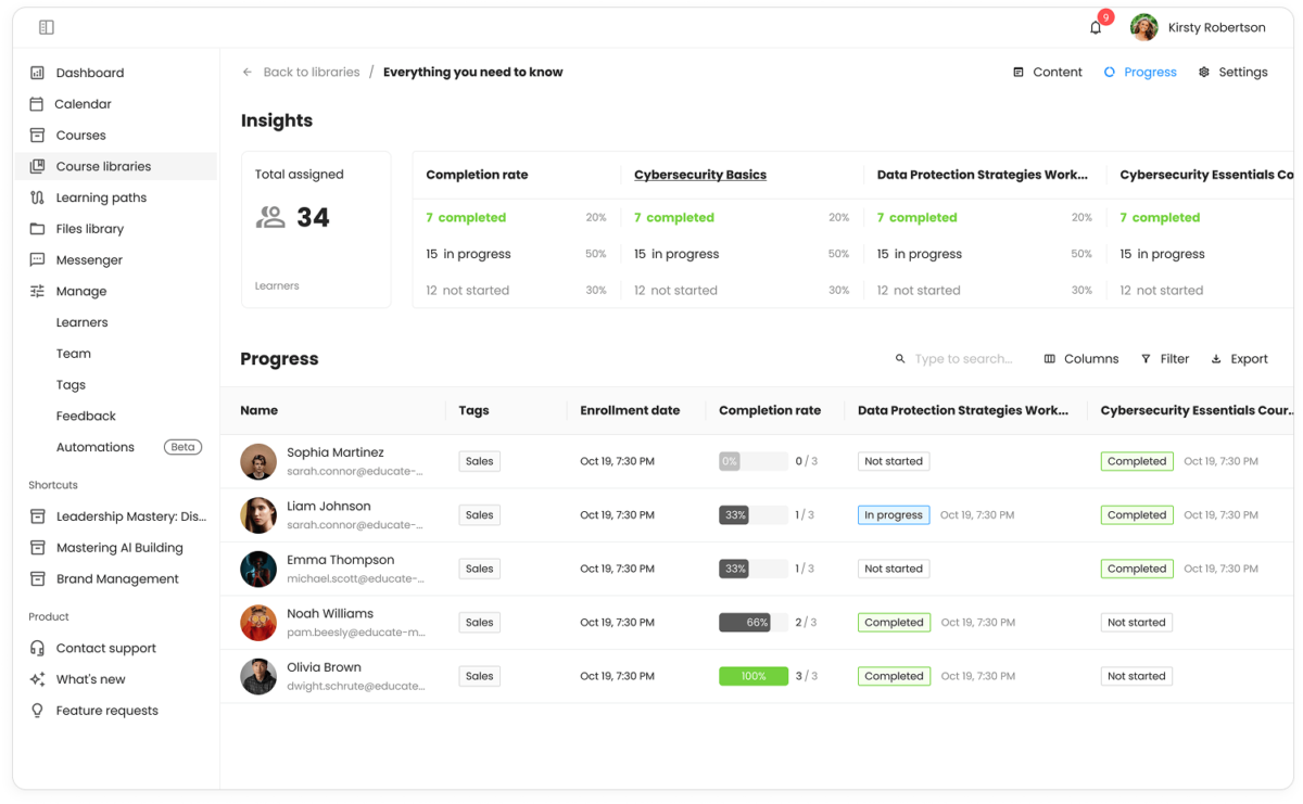 It’s a flexible and customizable LMS, supporting live, instructor-led, and self-paced training. Moreover, it offers advanced admin and role levels, AI-powered tools, and flexible content and tool integrations.
