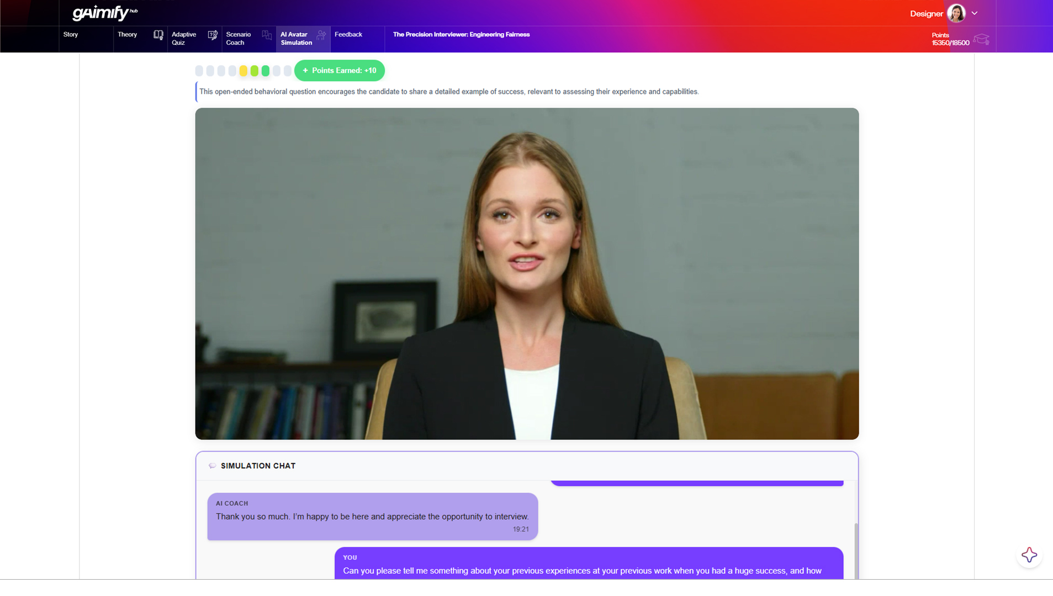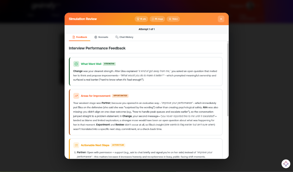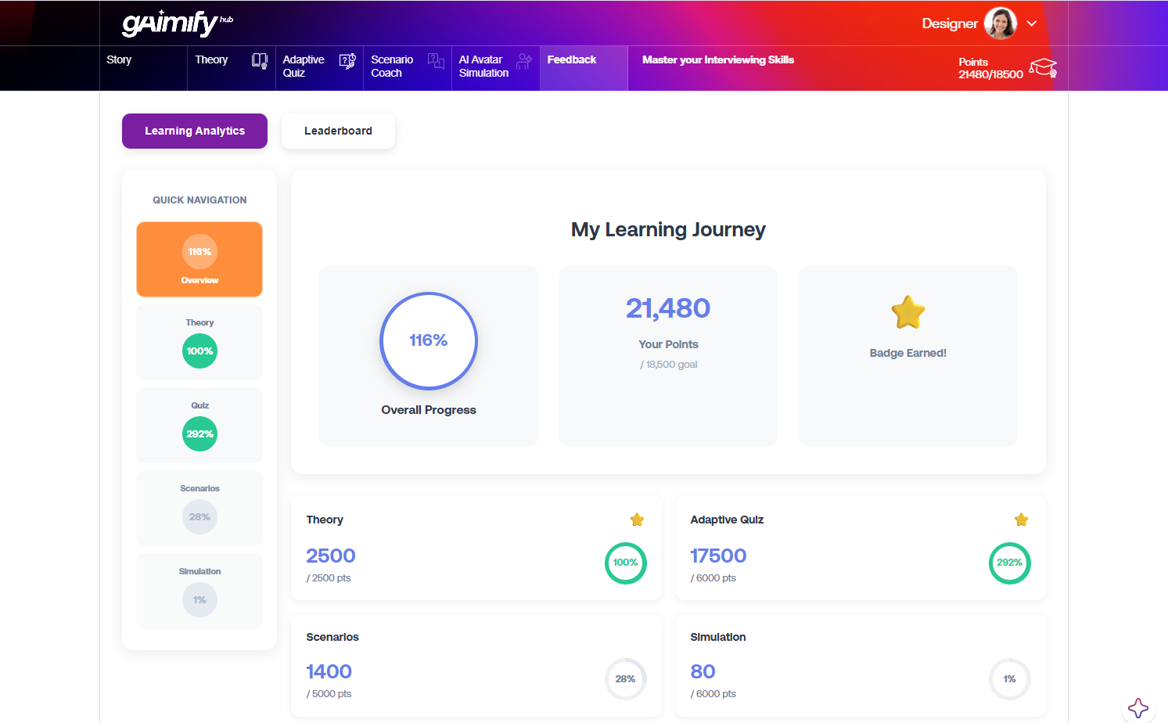 For learners, gAImify Hub creates a more active and developmental experience. Adaptive quizzes respond to performance in real time. Open-ended scenarios allow learners to answer in their own words and receive more targeted feedback. Voice-to-voice avatar simulations make it possible to rehearse real conversations in a safe but realistic environment. Gamified journeys add momentum, visibility, and engagement with purpose.