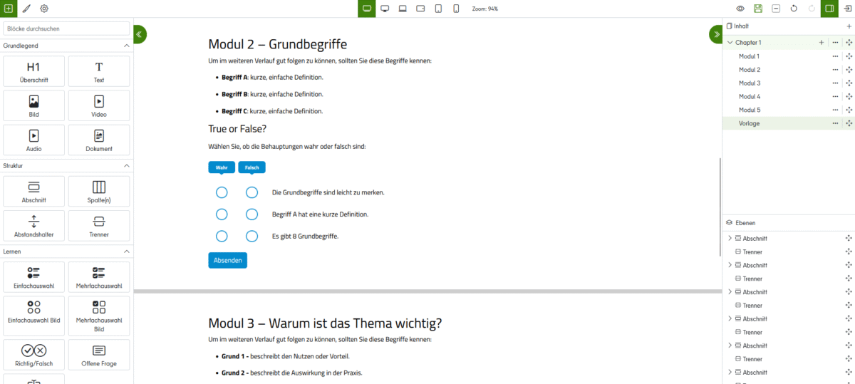 Lessonator was developed to make e-learning as easy, efficient, and professional as possible—whether you’re an HR manager, trainer, or subject matter expert. Our editor adapts to your daily work routine, not the other way around.
