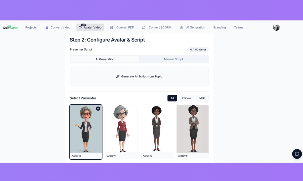 - AI Avatar Video. Select an illustrated presenter, choose a natural AI voice, and generate video lessons with lip-sync, subtitles, and interactive knowledge checks. No cameras, no studios, no actors.