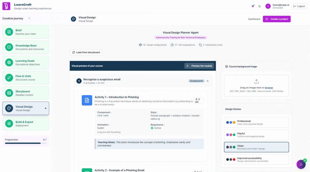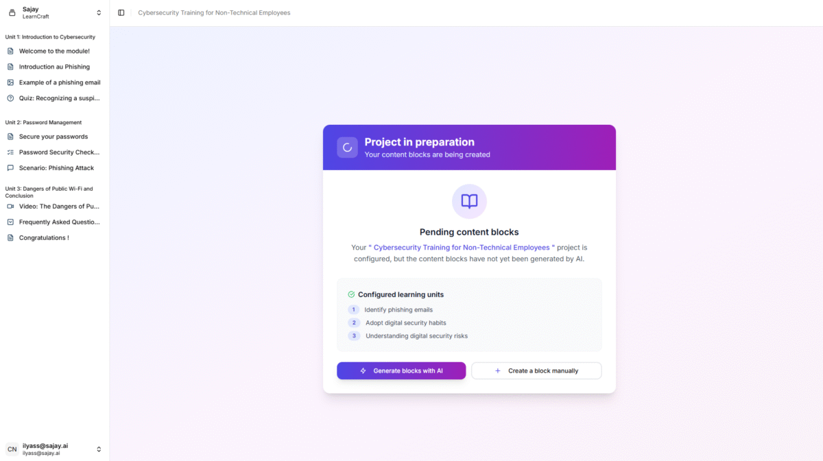 Sajay Craft is an AI-powered authoring platform that enables anyone, from subject matter experts to instructional designers, to create complete, high-quality e-learning experiences effortlessly. It guides users through a structured creative journey: defining training needs, uploading knowledge resources, generating objectives, structuring course flows, producing storyboards, customizing visuals, and exporting in SCORM, xAPI, or directly to Sajay Reach LMS. Beyond content creation, Sajay Craft integrates branding customization, collaborative editing, and a built-in project management task system that supports teamwork, version control, and workflow tracking. By combining automation with pedagogical intelligence, it transforms raw knowledge into branded, interactive, and ready-to-deploy courses, accelerating production while ensuring consistency, engagement, and quality.
