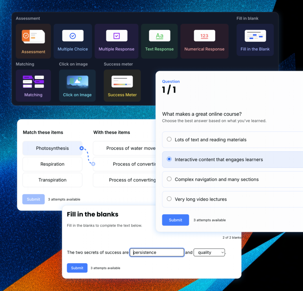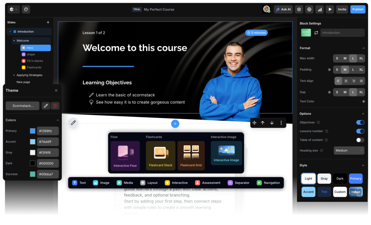 ScormStack is well suited for compliance training, onboarding, internal training, customer education, and academic learning content. Teams can create structured courses, add interactive blocks and assessments, manage progression, and publish LMS-ready learning experiences without advanced technical skills.