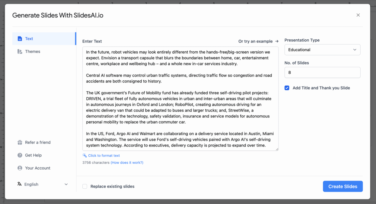 You can choose from three plans – Basic (Free), Pro, and Premium – to unlock a spectrum of features tailored to meet diverse user needs. With Text to Presentation, the process is as straightforward as pasting your text into SlidesAI, automatically generating a polished presentation for you. For a select few users, it has unveiled the innovative Topic to Presentation feature, allowing you to provide a topic, and SlidesAI crafts a presentation, making the creation process even more efficient.