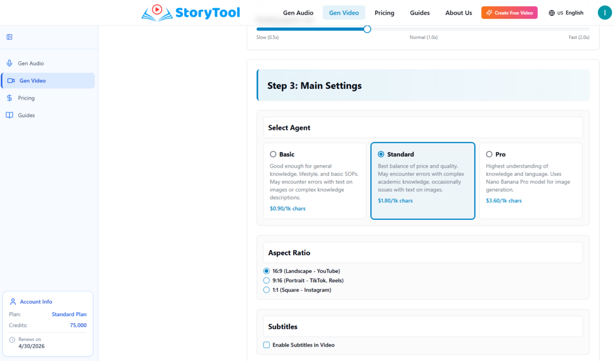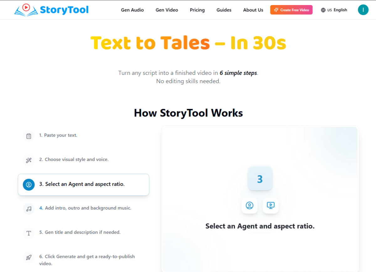 Just paste your text, choose an Agent and style, and click Generate. StoryTool handles scenes, images, voiceover, and timing for you.