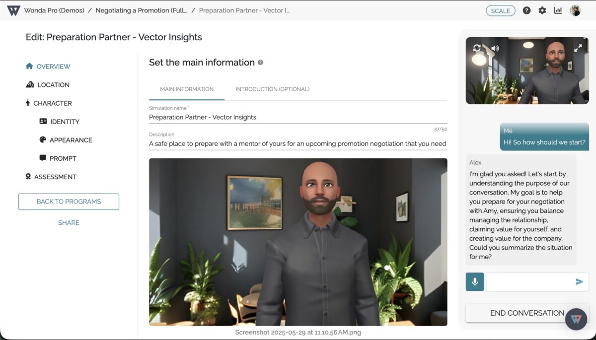 Wonda Pro is a no-code platform that enables educators and learning designers to build, deploy, and assess AI-powered conversation simulations — without any coding or 3D design expertise.