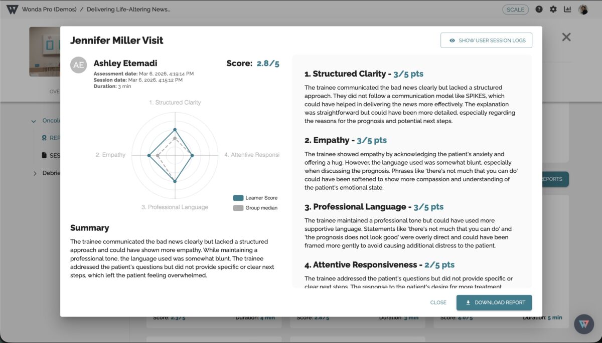 Each AI character is configured with a custom identity, voice, backstory, and behavioural instructions written by the instructor. Learners access simulations from any browser, interact via voice conversation, and receive a personalised assessment report at the end of each attempt. That report is generated by analysing the full conversation transcript against up to six competency criteria defined by the learning designer — not generic rubrics, but criteria grounded in the programme's own framework.