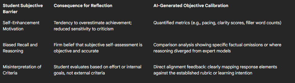 The aim of reflection is for students to judge their performance realistically. This is where technology becomes essential. By providing depersonalized, data-driven feedback at the moment reflection happens, AI helps calibrate the student's internal perception with objective external performance data.