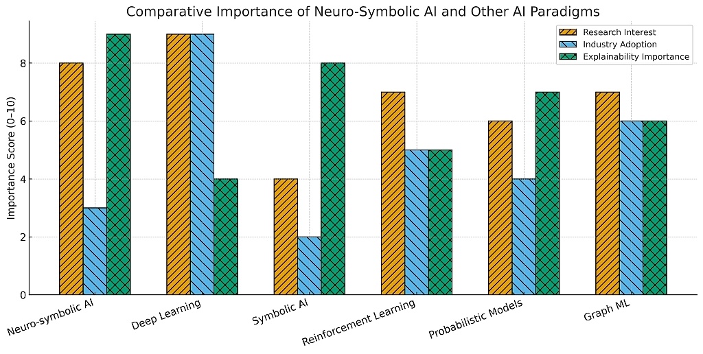 The future of NSAI is closely tied to developments in neural networks, whose capabilities and limitations both motivate and constrain NSAI approaches. Recent progress in Large Language Models (LLMs) is especially noteworthy, as these systems increasingly demonstrate proficiency in mathematical and logical tasks traditionally associated with symbolic AI. Figure 2 compares several major AI system categories, reflecting their current levels of industry adoption, research interest, and explainability (defined here as the extent to which a model's internal processes or outputs can be clearly understood).