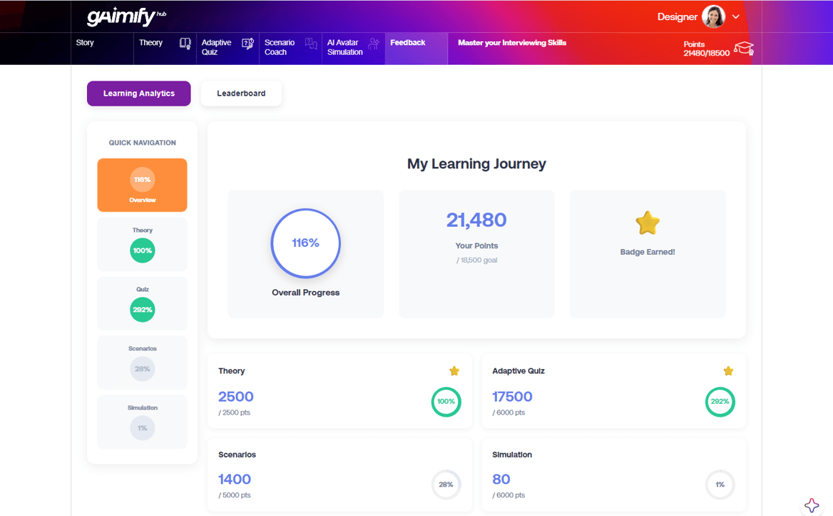 gAImify Hub responds to this through custom storytelling and gamified learning journeys. Story gives context. Gamification gives movement. Together, they help learning feel more purposeful and memorable. Learners can move through experiences that are better connected to role reality, while challenges, progress markers, and visible development help sustain engagement over time.